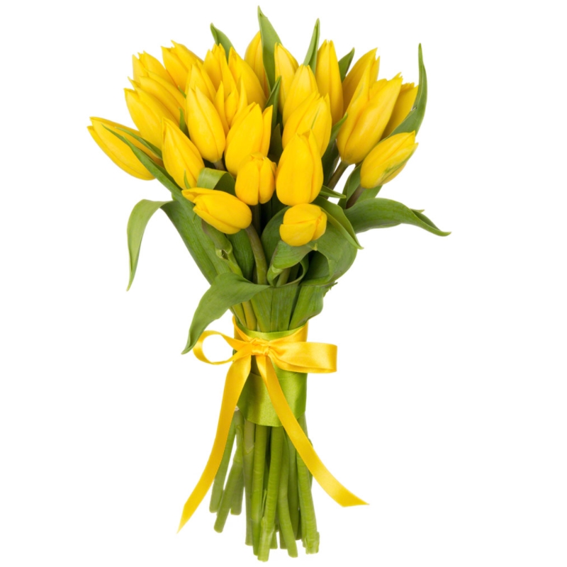 Букет состоит из 21 желтый тюльпан, прозрачная упаковка, атласная лента.