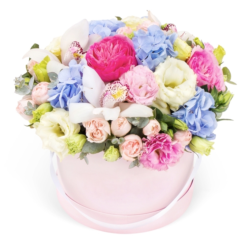 Букет состоит из 3 пионовидные розы, 5 кустовых пионовидных роз, 3 орхидеи, 5 эустом, 1 гортензия, зелень, коробка, оазис.