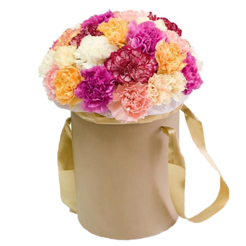 Букет состоит из MIX из 25 гвоздик, коробка, оазис.