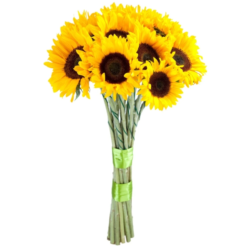 Букет состоит из 13 подсолнухов, прозрачная упаковка, атласная лента.